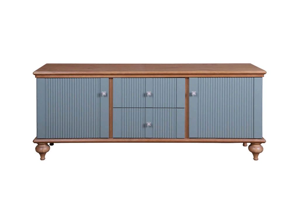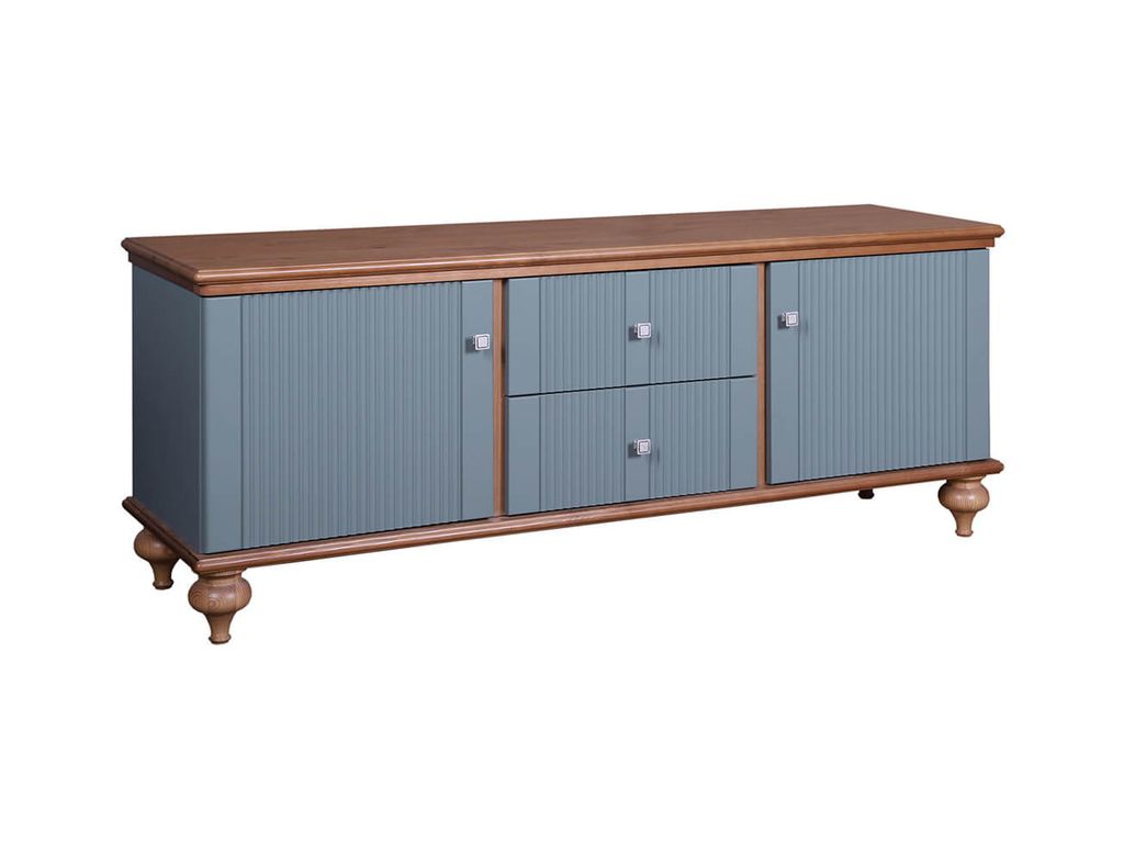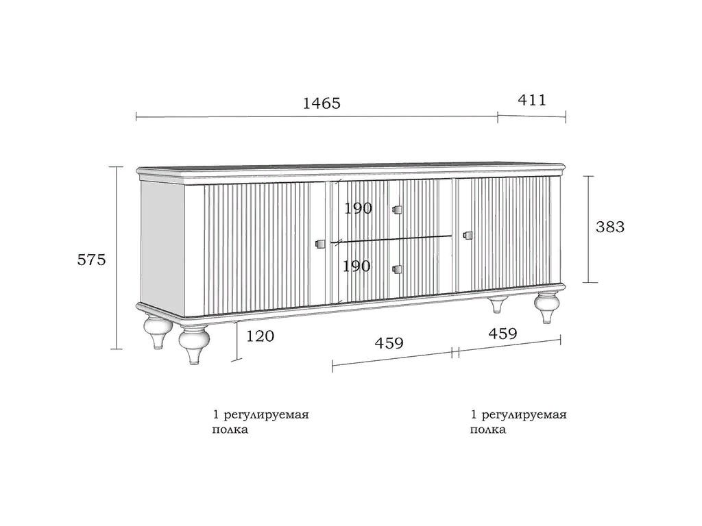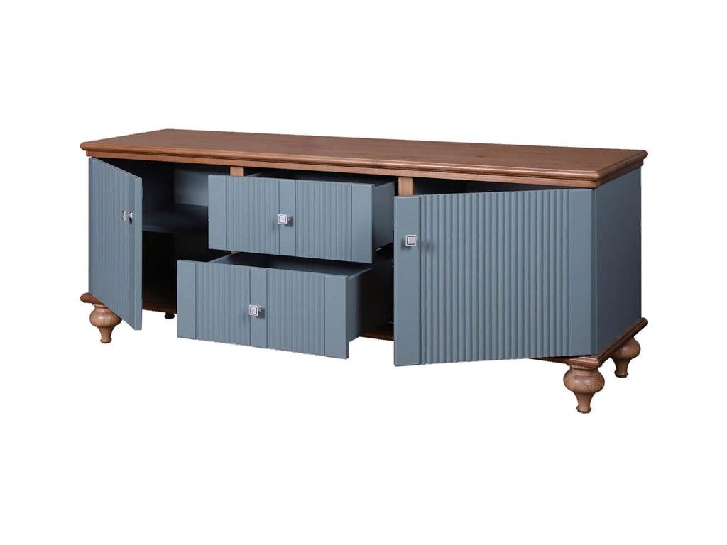 Описание: тумба ТВ оснащена двумя выдвижными ящиками и двумя полками за распашными дверями. Фурнитура на ящиках и дверях с доводчиками. Высокие ножки обеспечивают оптимальный доступ при уборке.