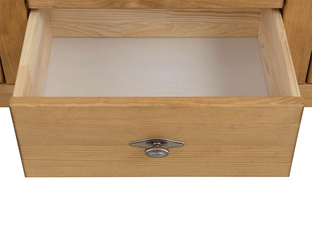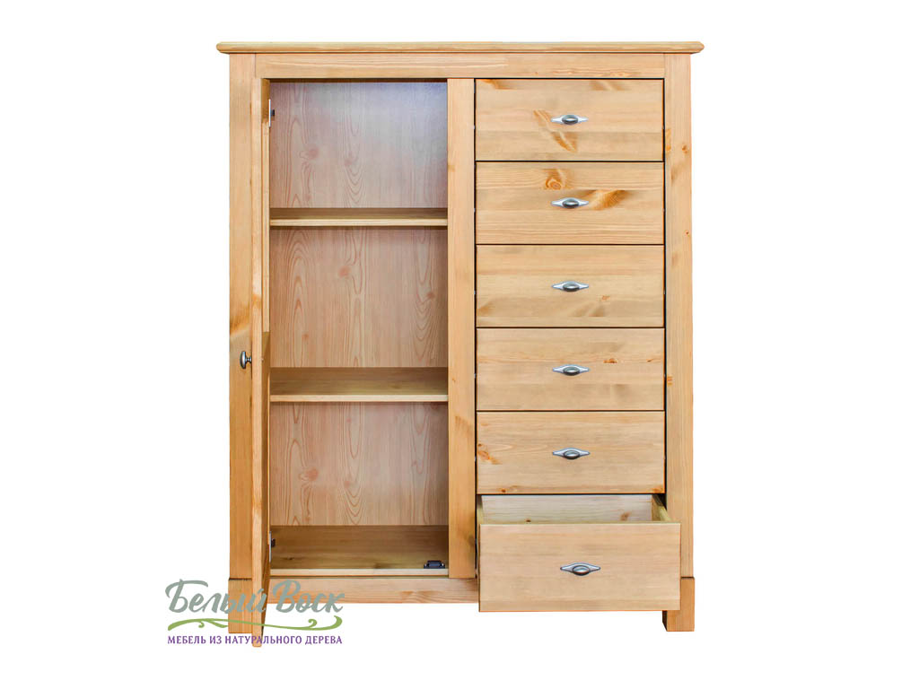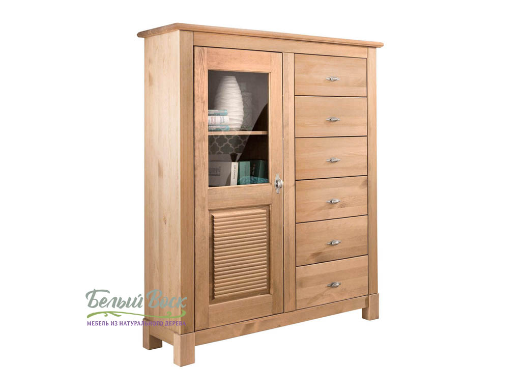 Комод Рауна займет достойное место в гостиной или столовой. С одной стороны оборудован шестью выдвижными ящиками, с другой - тремя полками для посуды или постельного белья, прикрытых наполовину стеклянной дверцей. Высокие ножки обеспечивают оптимальную устойчивость и хороший доступ во время уборки.