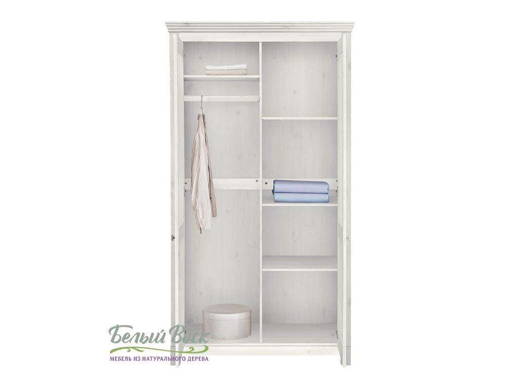 Шкаф для одежды Рауна — компактный и практичный. За двумя распашными дверями находятся отделение для одежды со штангой и четыре полки, где можно хранить постельное белье, полотенца и другие вещи. Завершает картину эффектная фурнитура "под старину".