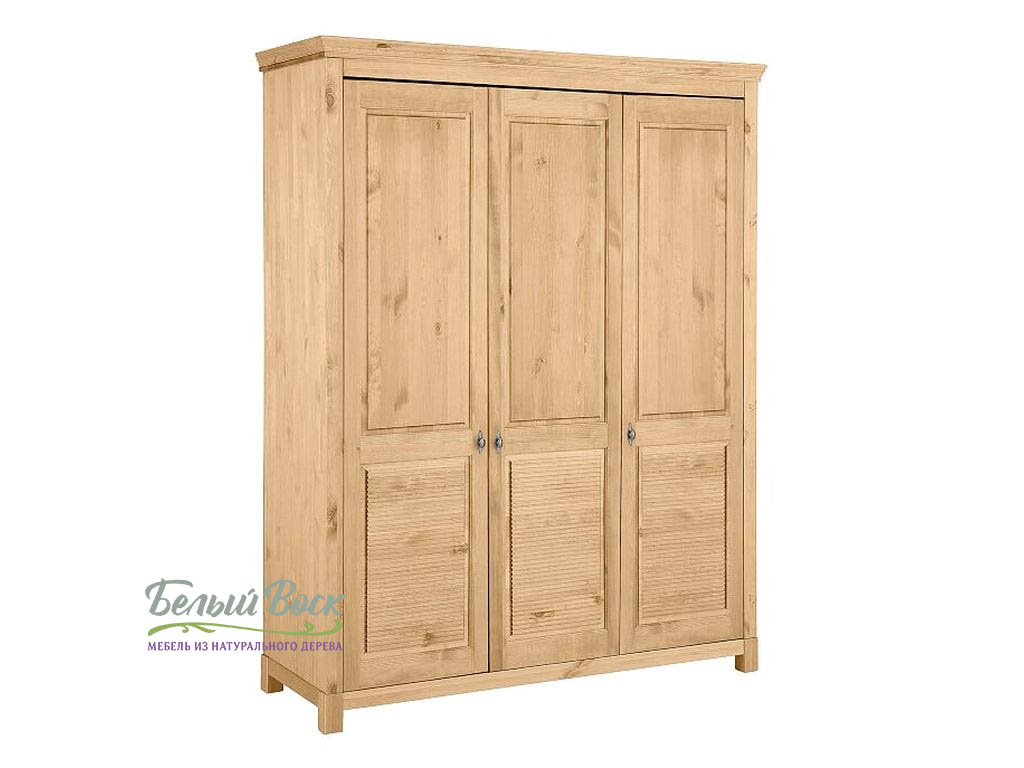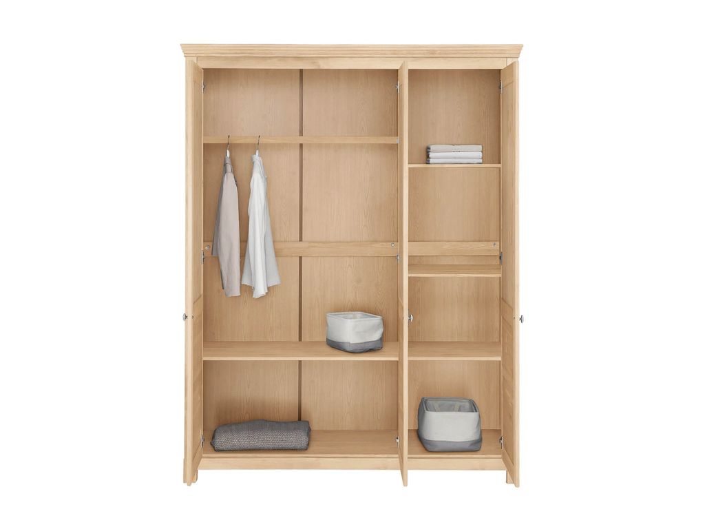 Трехстворчатый шкаф для вещей Рауна удачно впишется в интерьер загородного дома или небольшой квартиры. Он отличается простым, но при этом практичным дизайном. Внутри вы найдете отделение для одежды со штангой, секцию с 4 полками и место для хранения обуви.