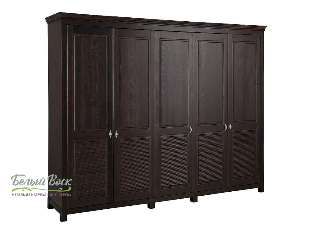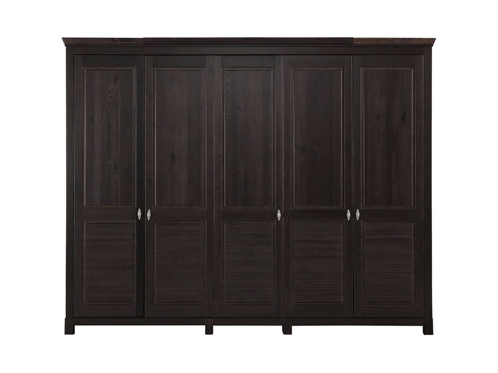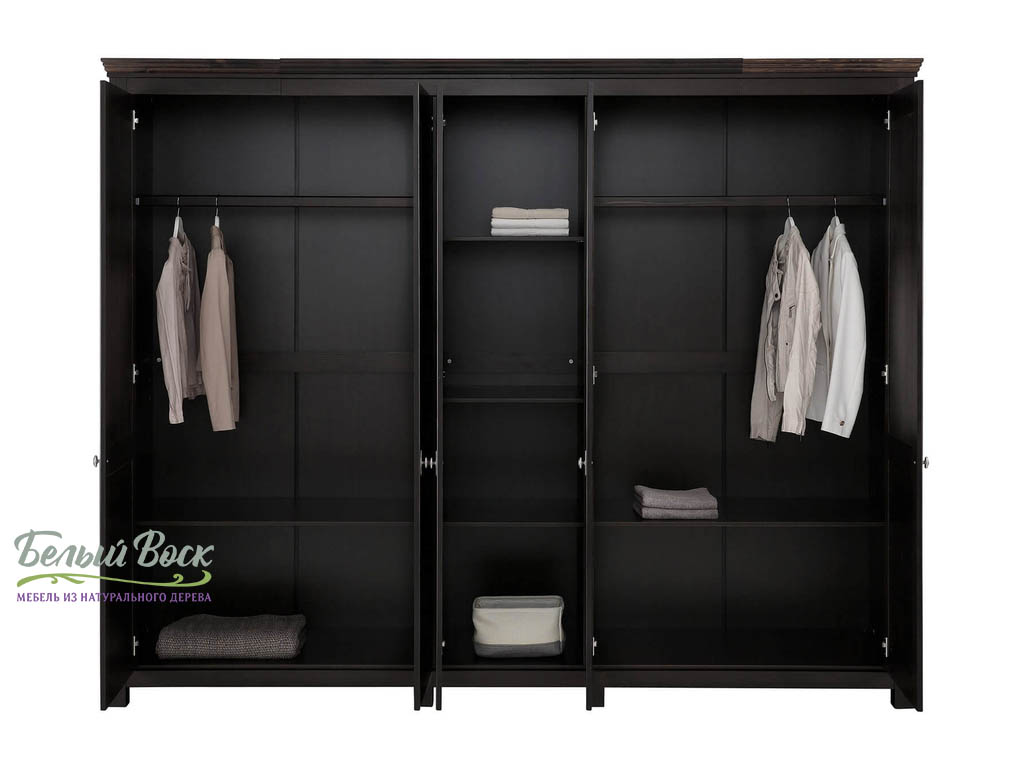 Просторный пятидверный шкаф Рауна для тех, кто не привык урезать свои потребности. За пятью распашными дверями находятся два отделения для одежды со штангами и шесть секций для хранения других вещей и обуви. Такое изделие удачно впишется в любой современный интерьер.