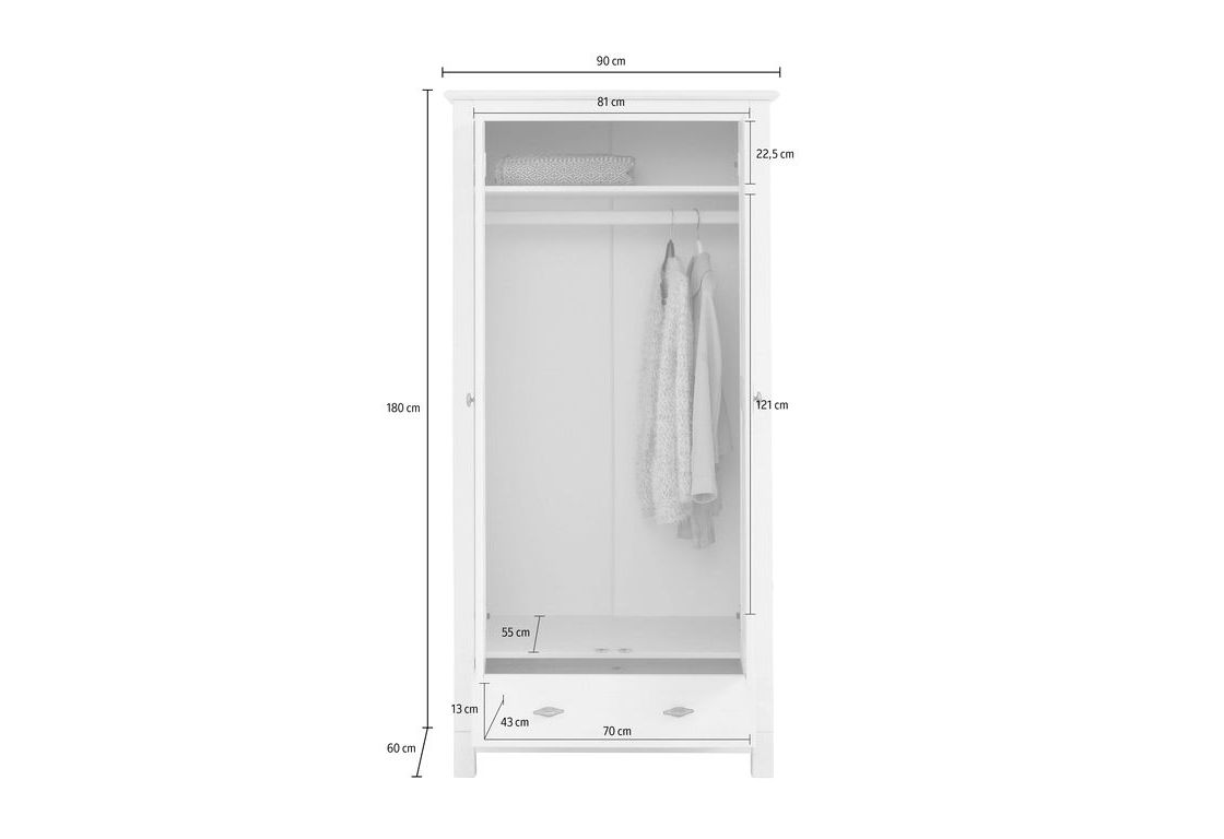 Шкаф Рауна с двумя распашными дверями - хорошее приобретение для небольшой комнаты или коридора. Оснащен штангой для верхней одежды, отделением для шляп и широким выдвижным ящиком снизу. Изготовлен из натуральной древесины, благодаря чему имеет эстетически приятный внешний вид и длительный срок эксплуатации.