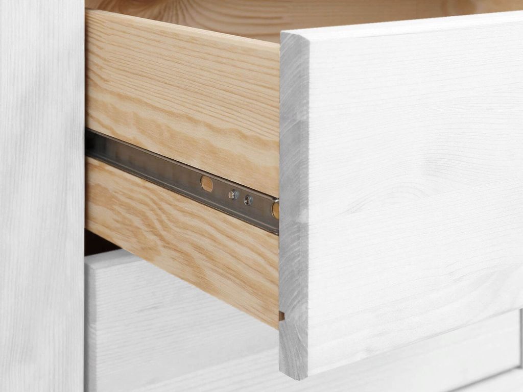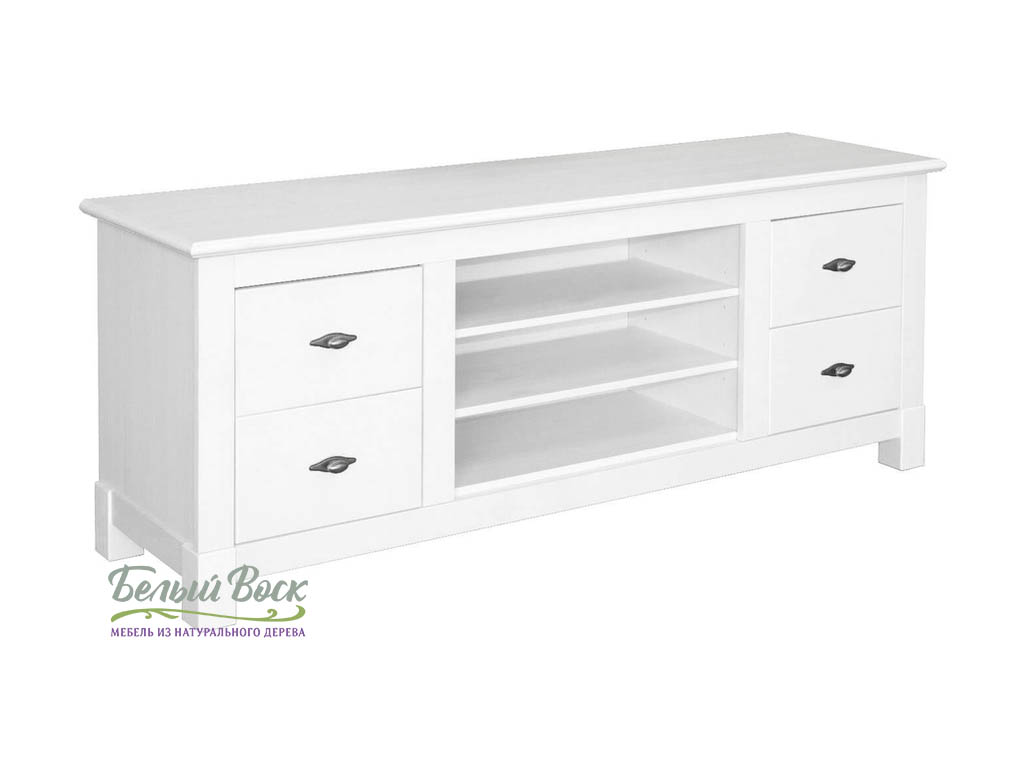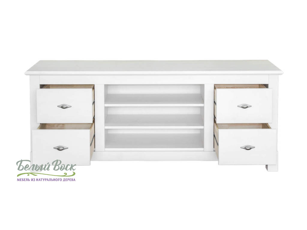 Широкая тумба под телевизор Рауна также выполняет функции комода. Она оснащена четырьмя выдвижными ящиками, тремя полками для приставок, хранения пультов и журналов. Устойчивые ножки, крепкая столешница и строгий дизайн делают этот предмет мебели универсальным.