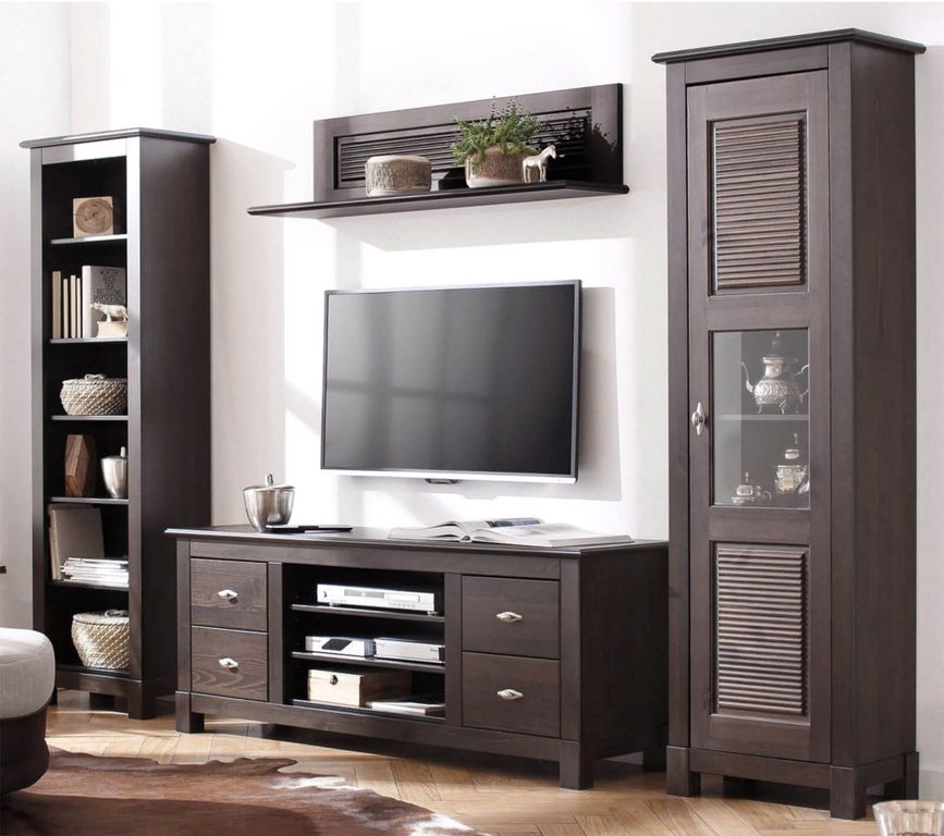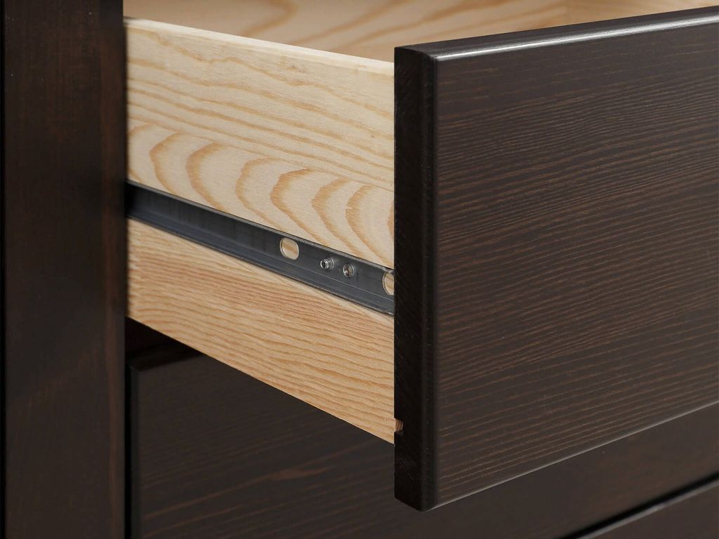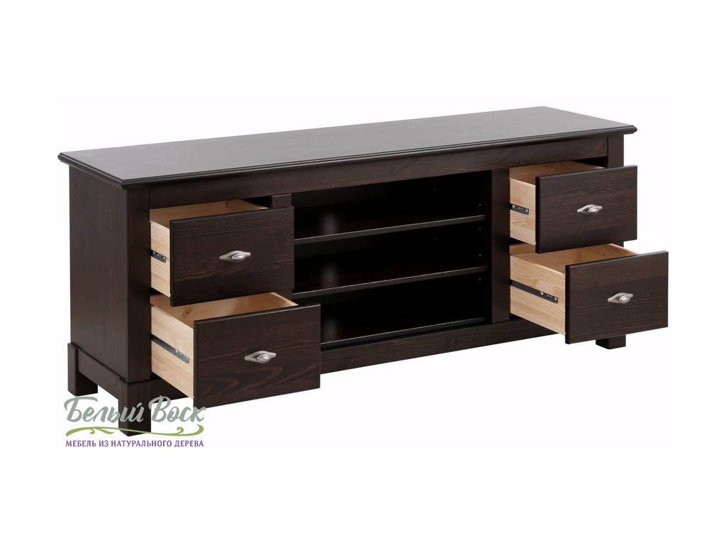Широкая тумба под телевизор Рауна также выполняет функции комода. Она оснащена четырьмя выдвижными ящиками, тремя полками для приставок, хранения пультов и журналов. Устойчивые ножки, крепкая столешница и строгий дизайн делают этот предмет мебели универсальным.