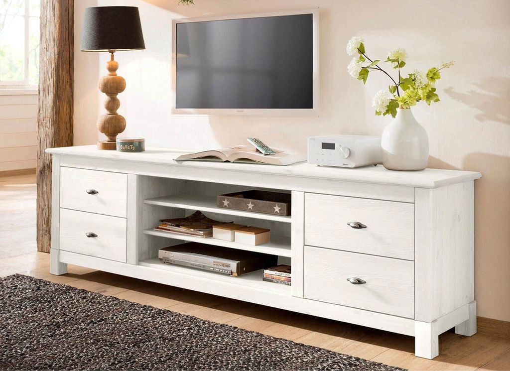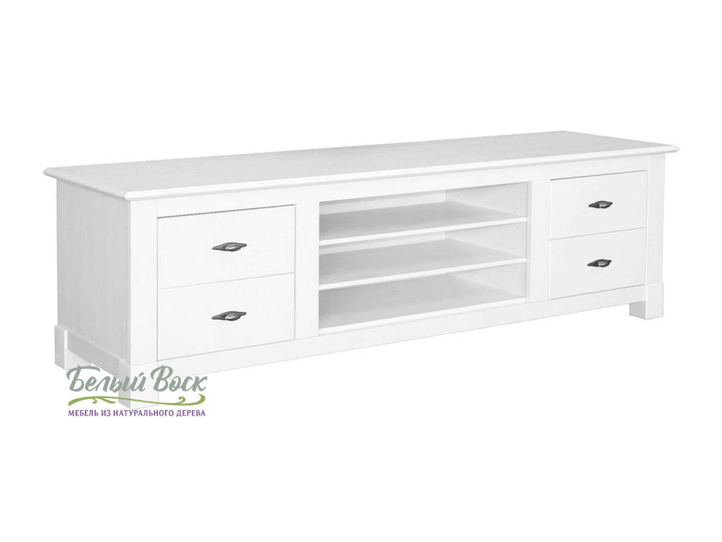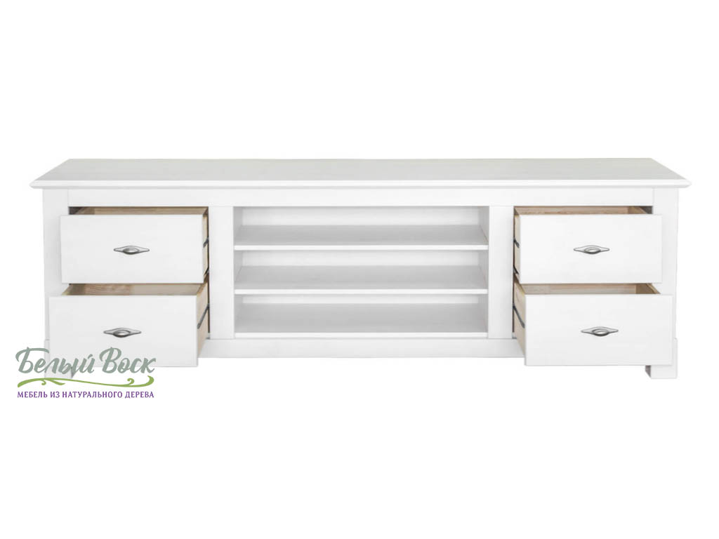 Тумба под ТВ Рауна с достоинством выдержит даже самый большой телевизор. На ее внушительной поверхности можно разместить приставки, роутер, элементы интерьера. Оснащена четырьмя выдвижными ящиками и тремя открытыми полками.