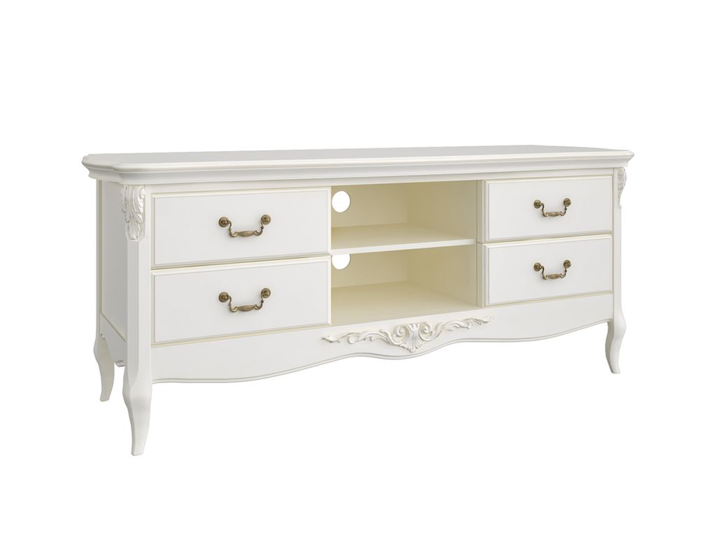 ТВ тумба рассчитана на современные ЖК телевизоры большой диагонали. В центральной части находятся две вместительные ниши под аудиотехнику, а для соединительных проводов предусмотрены специальные отверстия.