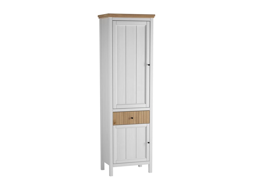 Шкаф для посуды имеет ящик на шариковых направляющих и две глухих дверки, за дверками расположены 3 и 1 полка.