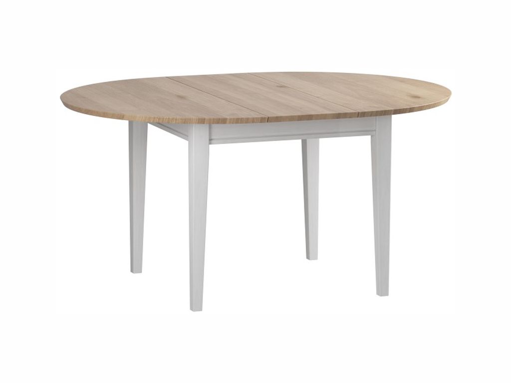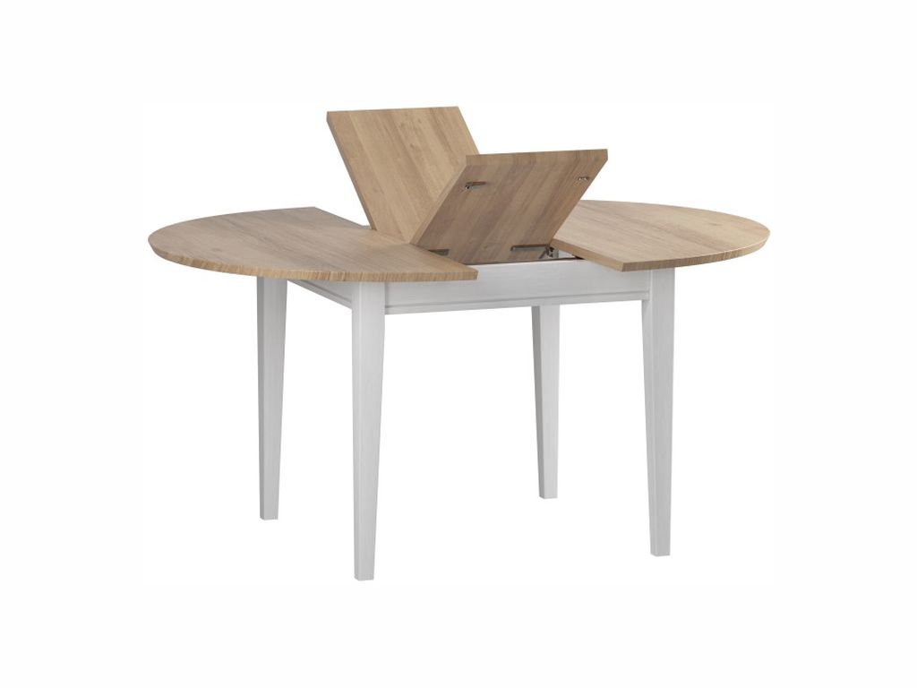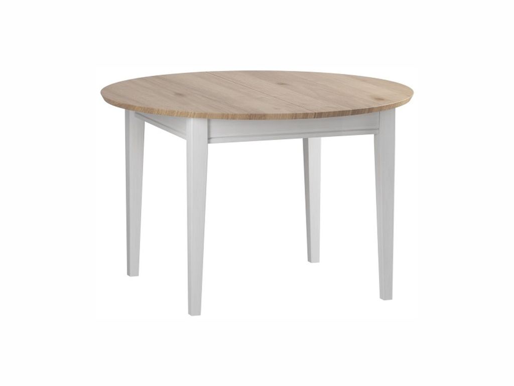 Раскладной обеденный стол из массива сосны. В сложенном состоянии вставка располагается под столешницей. Диаметр стола в сложенном состоянии 110 см, в разложенном состоянии размер стола 110х145 см.
