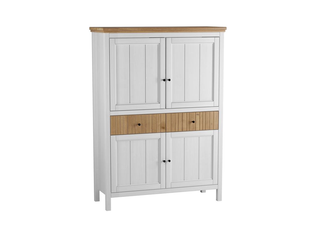 Тумба имеет два ящика на шариковых направляющих и четыре глухие дверки, за каждой дверкой расположена полка.