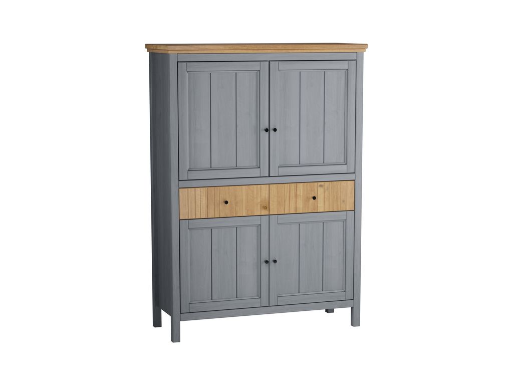 Тумба имеет два ящика на шариковых направляющих и четыре глухие дверки, за каждой дверкой расположена полка.