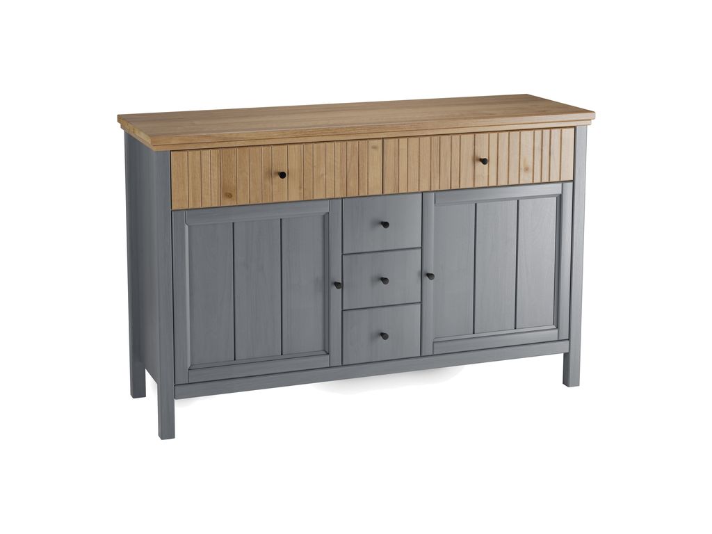 Тумба имеет пять ящиков на шариковых направляющих и две глухие дверки, за каждой дверкой расположена полка.