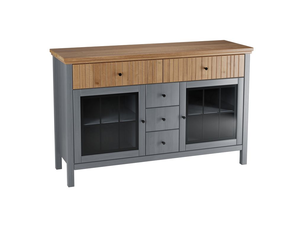 Тумба имеет пять ящиков на шариковых направляющих и две дверки со стеклом, за каждой дверкой расположена полка.