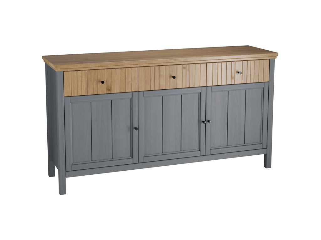 Тумба имеет три ящика на шариковых направляющих и три глухие дверки, за каждой дверкой расположена полка.