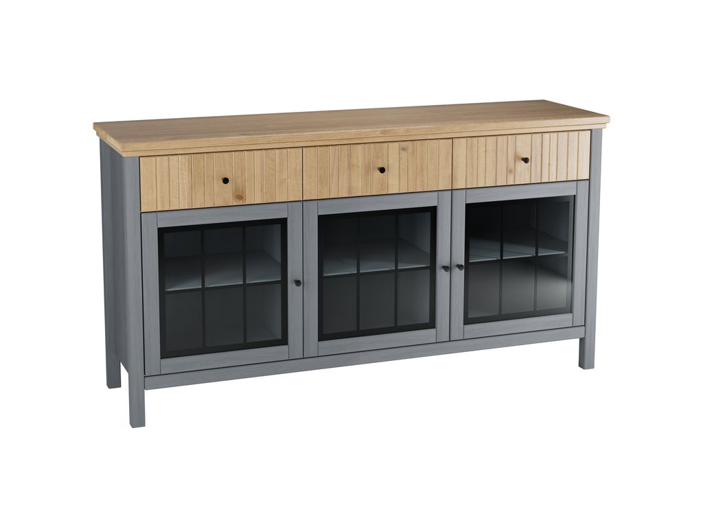 Тумба имеет три ящика на шариковых направляющих и три дверки со стеклом, за каждой дверкой расположена полка.