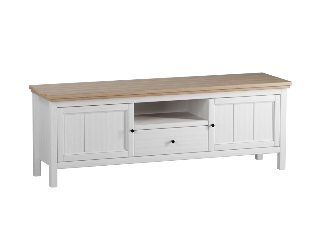 Тумба ТВ имеет выдвижной ящик на шариковых направляющих и две глухие дверки.