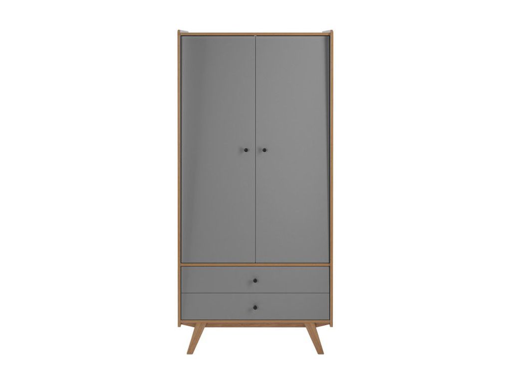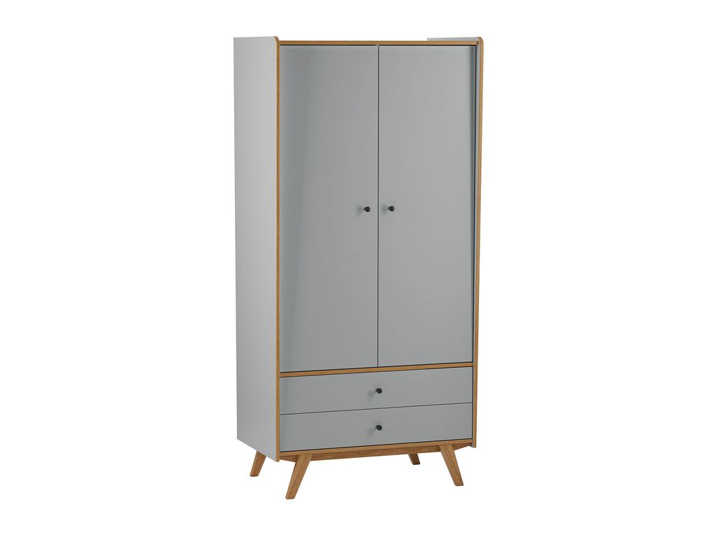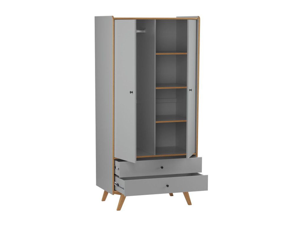 Описание: шкаф имеет 2 ящика на шариковых направляющих с доводчиками и 2 дверки. За каждой правой дверкой расположены три полки, за левой дверкой расположена штанга. Петли дверей с доводчиками.