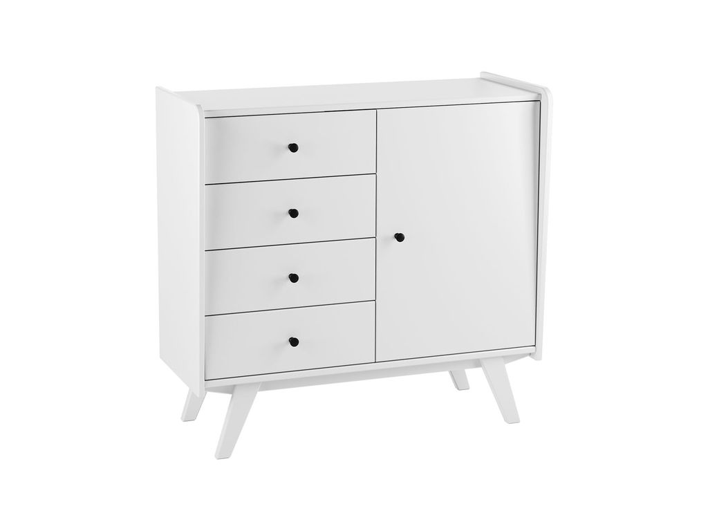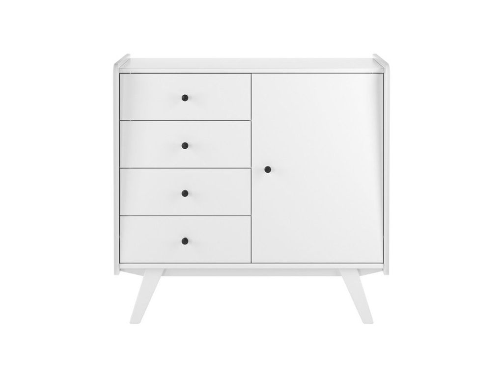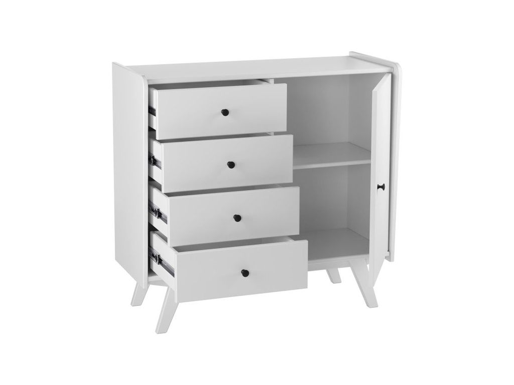 Описание: комод имеет 4 ящика на шариковых направляющих с доводчиками и 1 дверку. За дверкой расположена полка. Петли дверки с доводчиками.