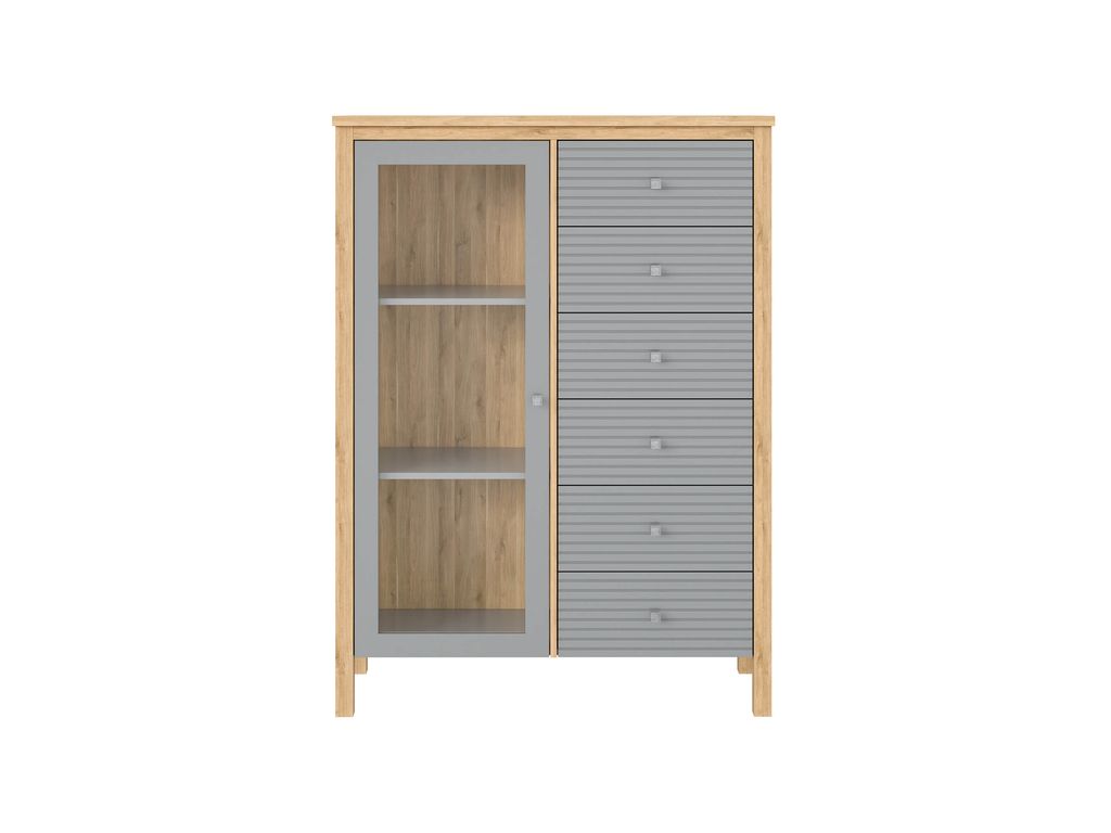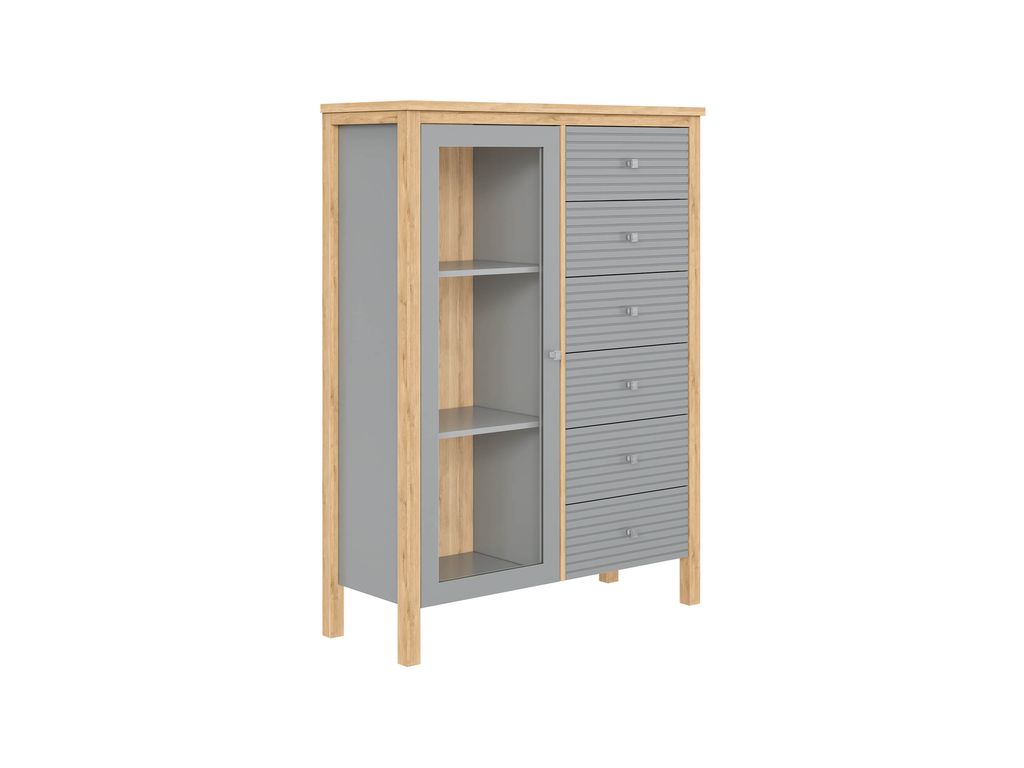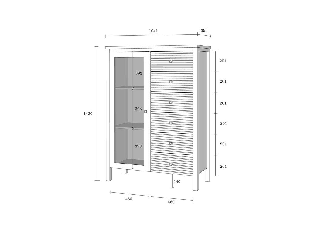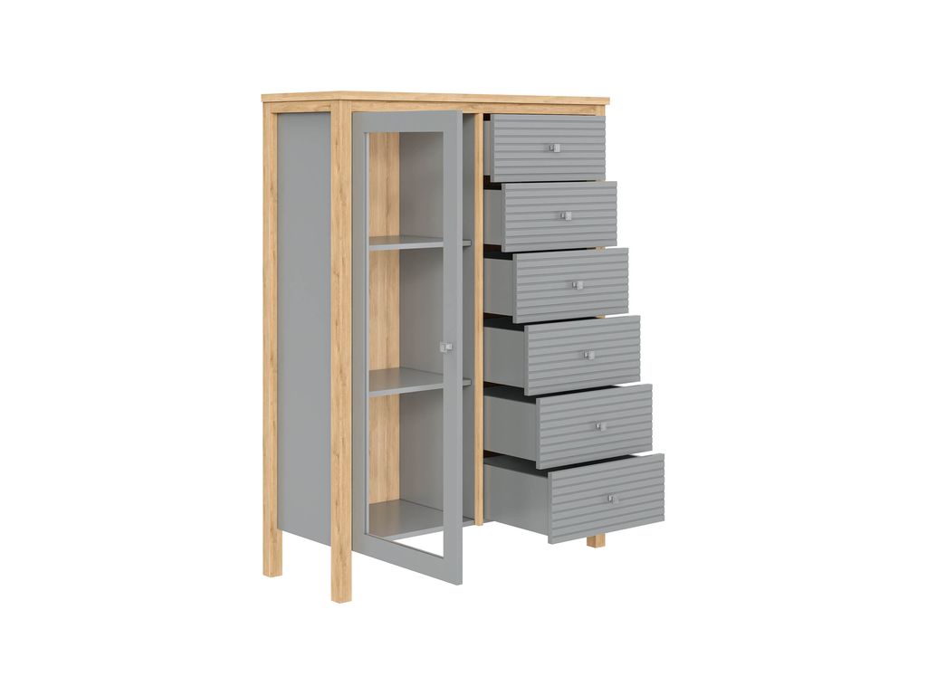Описание: тумба (комод) оснащен шестью выдвижными ящиками с горизонтальными прорезями и распашной, стеклянной дверкой с двумя полками. Фурнитура на ящиках и двери с доводчиками. Высокие ножки обеспечивают оптимальный доступ при уборке.