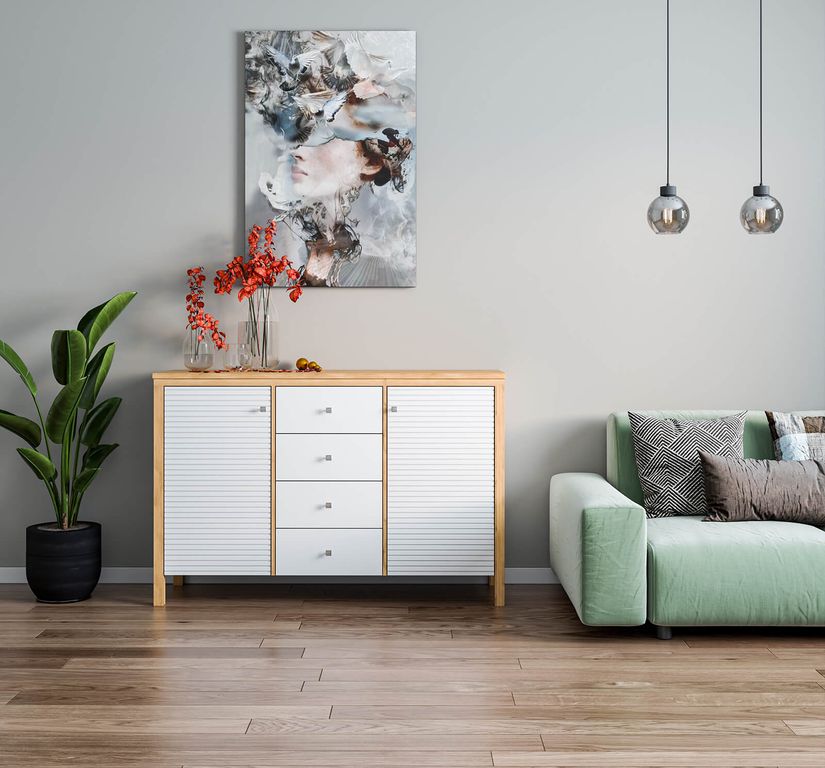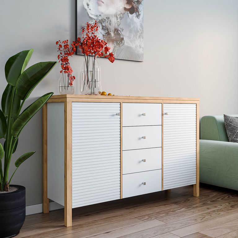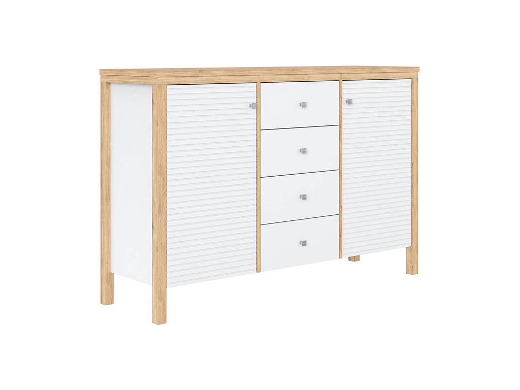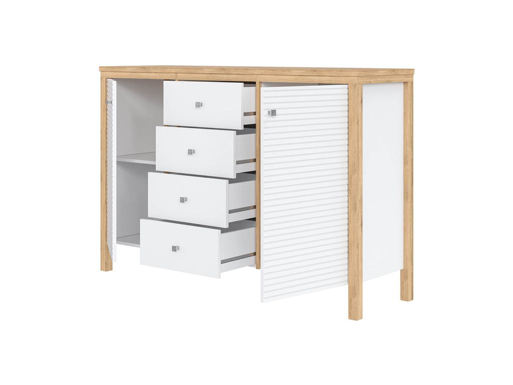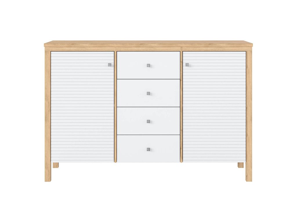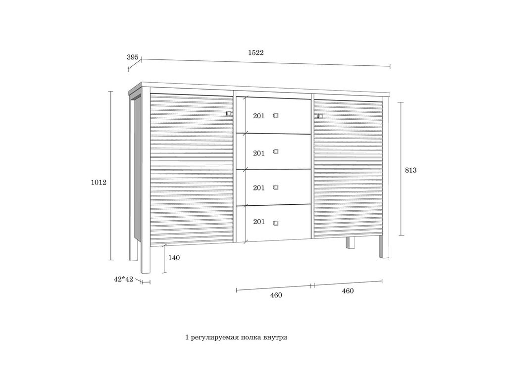 Описание: Тумба (комод) оснащена четырьмя выдвижными ящиками и двумя рифлёными, распашными дверками с полками. Фурнитура на дверях с доводчиками, на ящиках телескопические направляющие полного выдвижения. Высокие ножки обеспечивают оптимальный доступ при уборке.
