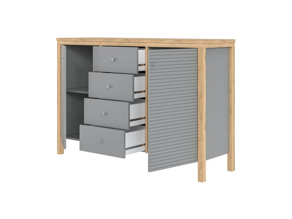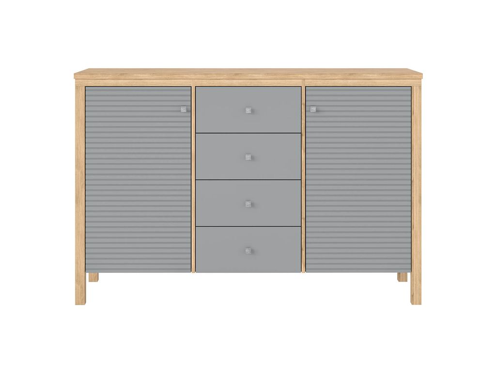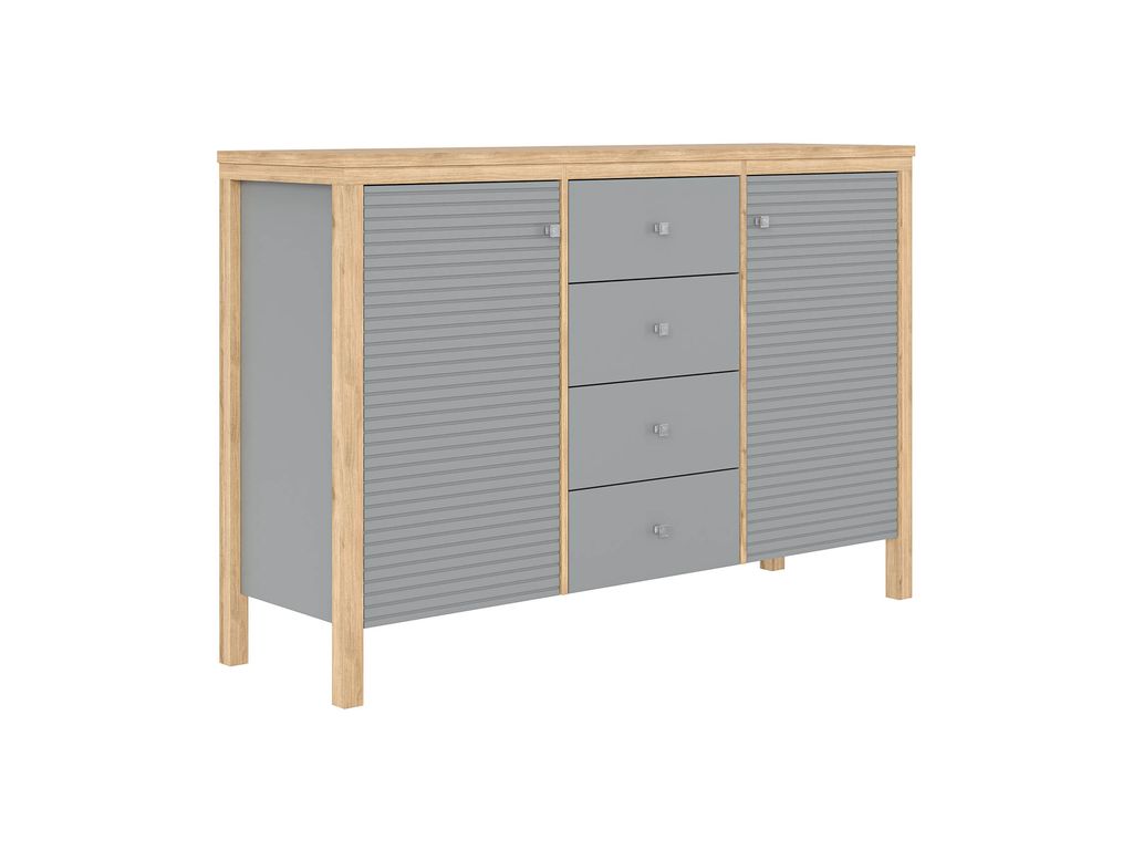 Описание: Тумба (комод) оснащена четырьмя выдвижными ящиками и двумя рифлёными, распашными дверками с полками. Фурнитура на дверях с доводчиками, на ящиках телескопические направляющие полного выдвижения. Высокие ножки обеспечивают оптимальный доступ при уборке.