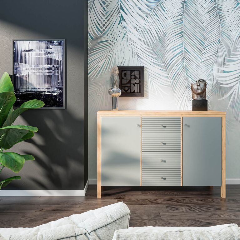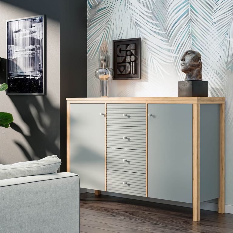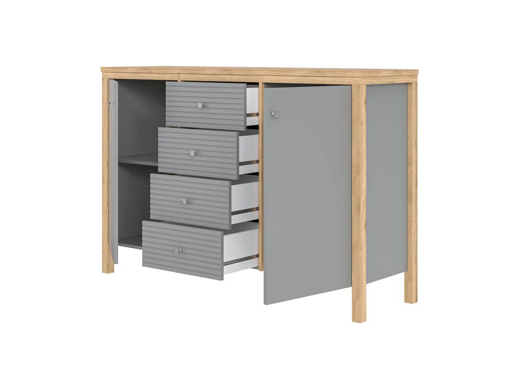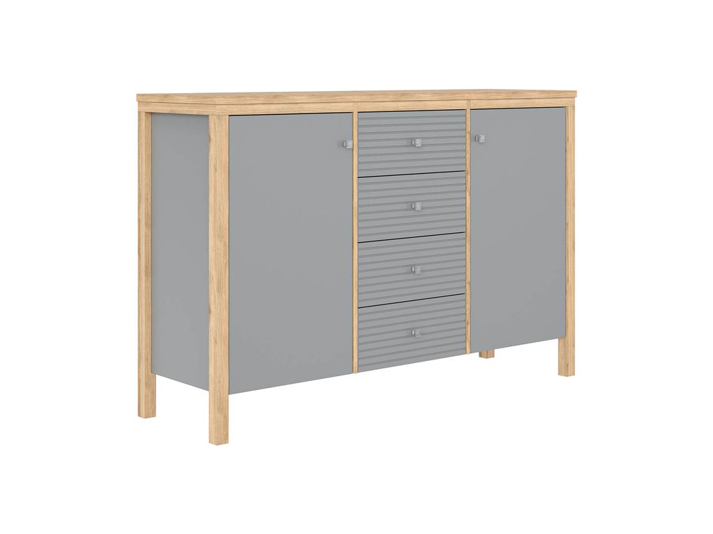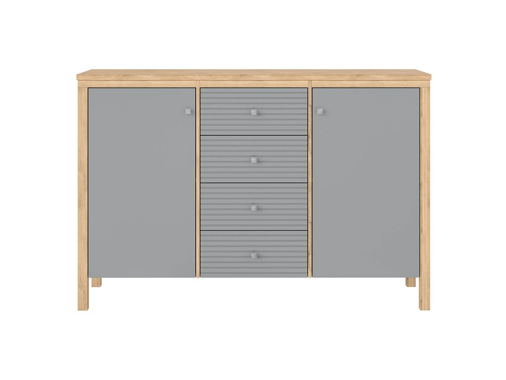 Описание: Тумба (комод) оснащена четырьмя рифлеными ящиками и двумя распашными дверками с полками. Фурнитура на дверях с доводчиками, на ящиках телескопические направляющие полного выдвижения. Высокие ножки обеспечивают оптимальный доступ при уборке.