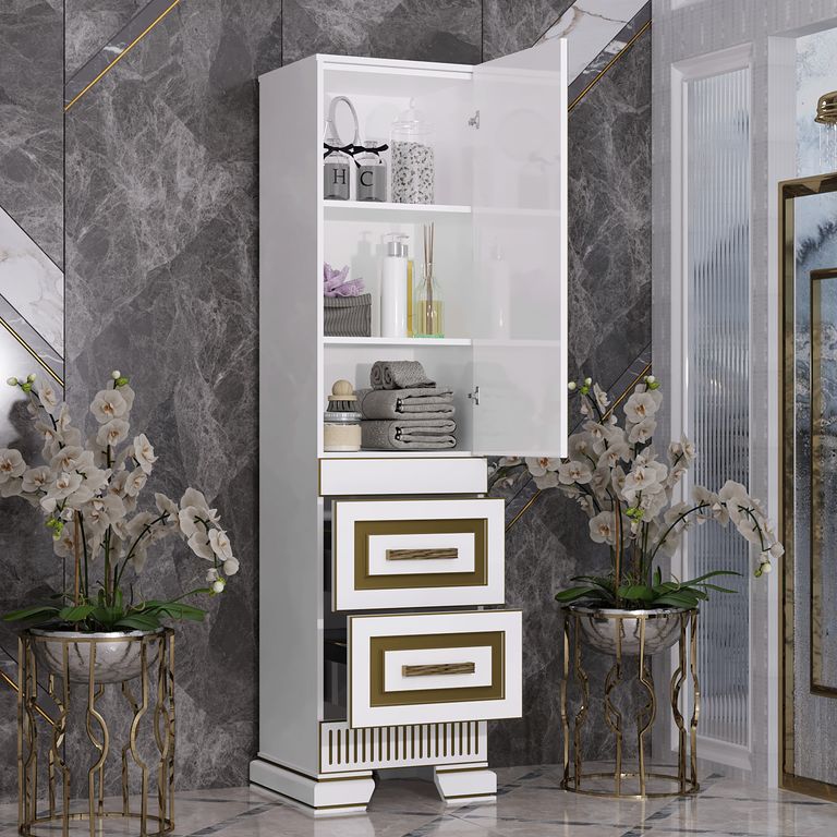 Современная и шикарная мебель для ванной комнаты ОНИКС изготавливается из высококачественного МДФ с глянцевым покрытием и декорируется золотой и серебристой патиной.