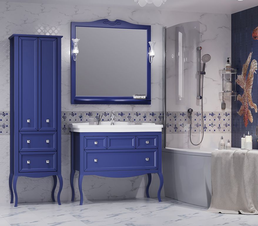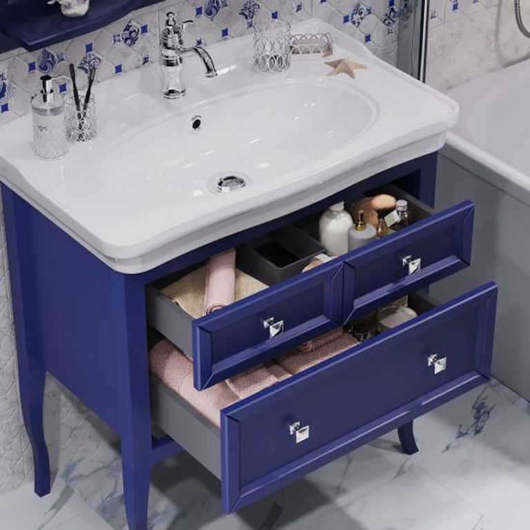Валери - это современная классика, которая придется по душе ценителям дизайнерской мебели в коллаборации с практичностью. Коллекция представлена в двух размерах 85 и 105 см, в цвете сапфир и белый матовый. Цвет сапфир очень насыщенный и глубокий. Мебель будет служить стильным арт объектом в любой ванной комнате. Вместительная тумба с тремя ящиками позволит разместить множество принадлежностей для ванной, чтобы убрать «визуальный шум». Квадратные ручки с гранями напоминают тот самый драгоценный камень сапфир. Мебель изготовлена из массива бука в сочетании с МДФ и покрыта несколькими слоями итальянской эмали и лака, чтобы радовать глаз ее владельца долгие годы. Ящики оснащены механизмами плавного закрывания Hettich (Германия). Тумба укомплектована глубокой керамической раковиной.