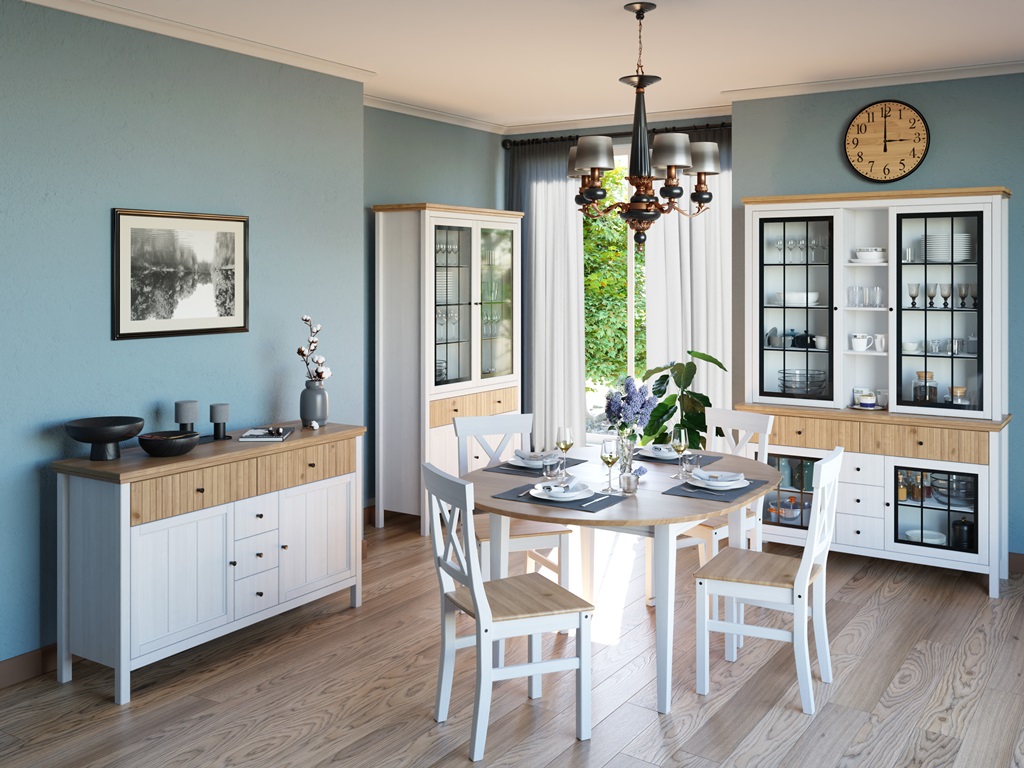 Сканди - коллекция в скандинавском стиле производится из массива сосны в двух цветовых вариантах: белый воск/антик, серый воск Ral 7046/антик. Для выдвижных ящиков используются шариковые направляющие фирмы Хефеле. Внутренние стенки ящиков окрашены в цвет фасадов. На стеклянных дверках используется закаленное стекло (при ударе рассыпается на мелкие кусочки), которое является безопасным. На внешнюю сторону стекла нанесена пленка, имитирующая декоративную расстекловку.