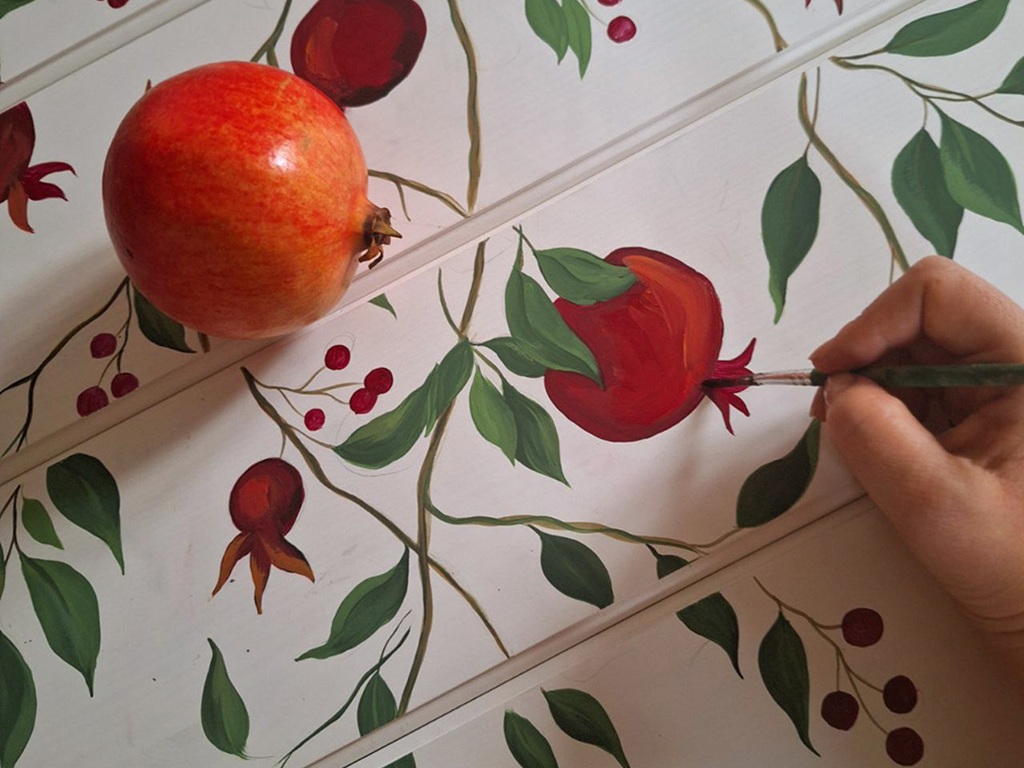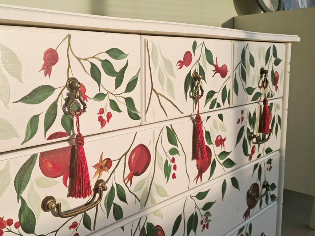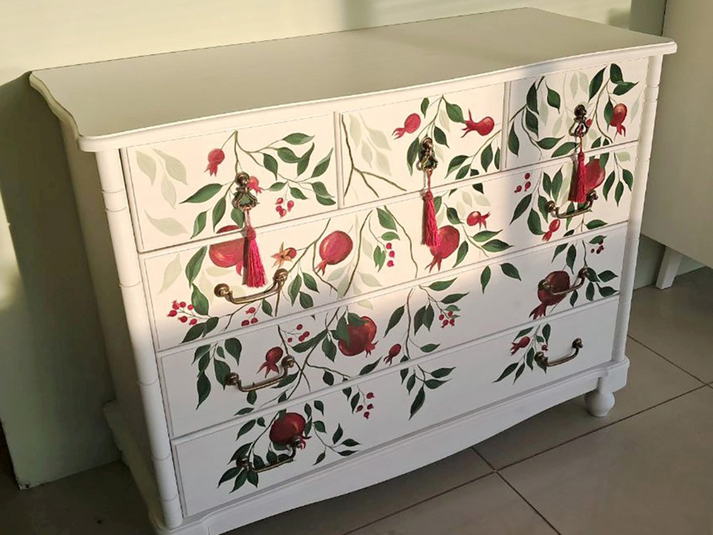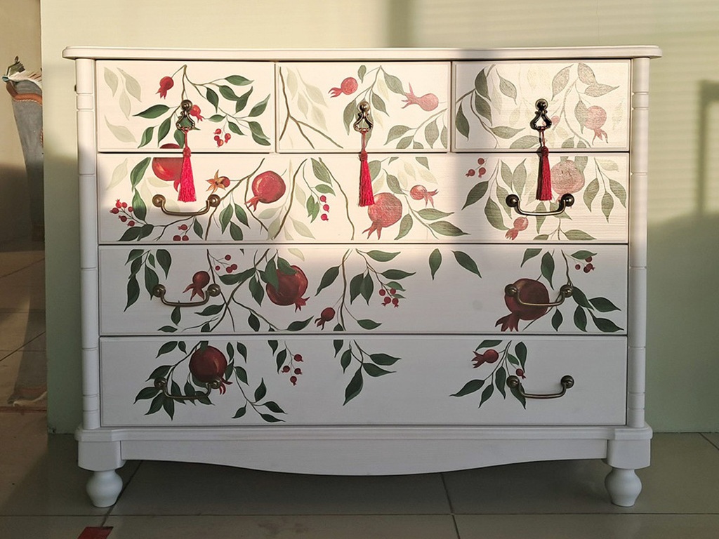 Комод из коллекции Айно, с индивидуальной росписью акрилом. Очень сочное окрашивание с ветвями и плодами граната, прекрасно дополнит ваш интерьер, добавит ему красок и позитива! Имеет 3 больших и 3 маленьких ящика на шариковых направляющих. Выполнен полностью из массива сосны.