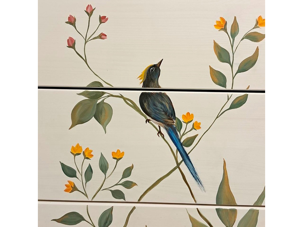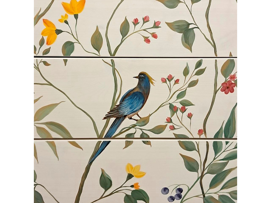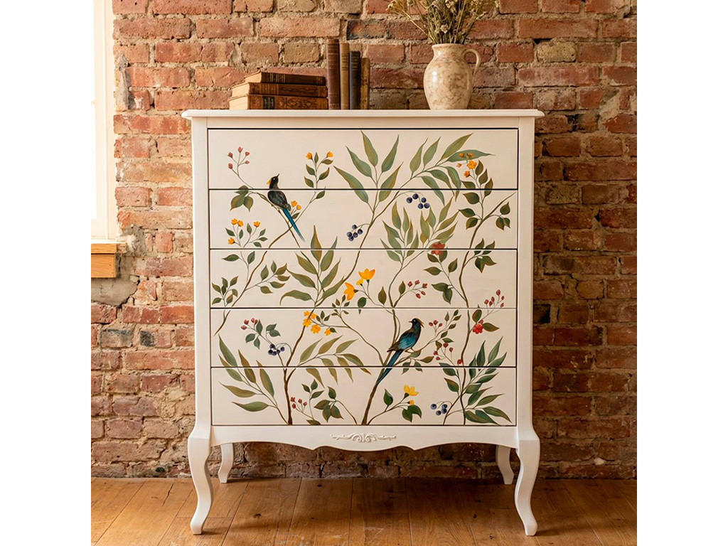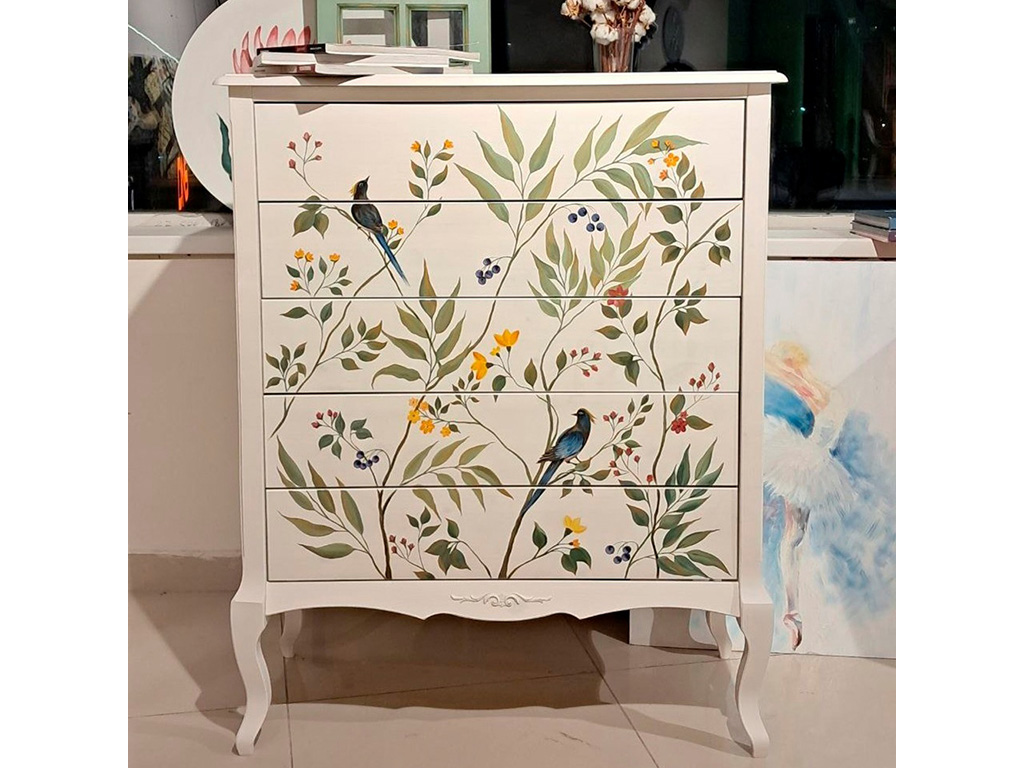 Комод из коллекции Ари-Прованс, с индивидуальной росписью акрилом. Нежные зеленые оттенки, и милые птички в ветвях - природная тематика, которая никого не оставит равнодушным. Комод достаточно большой, за счет этого поверхность с росписью займет значительный объем в комнате, создавая акцент. Комод ммеет 5 больших ящиков на шариковых направляющих с доводчиками. Ручки намеренно не установлены, сверловки под них нет. Выбрать и заказать можно любые, после чего установить.